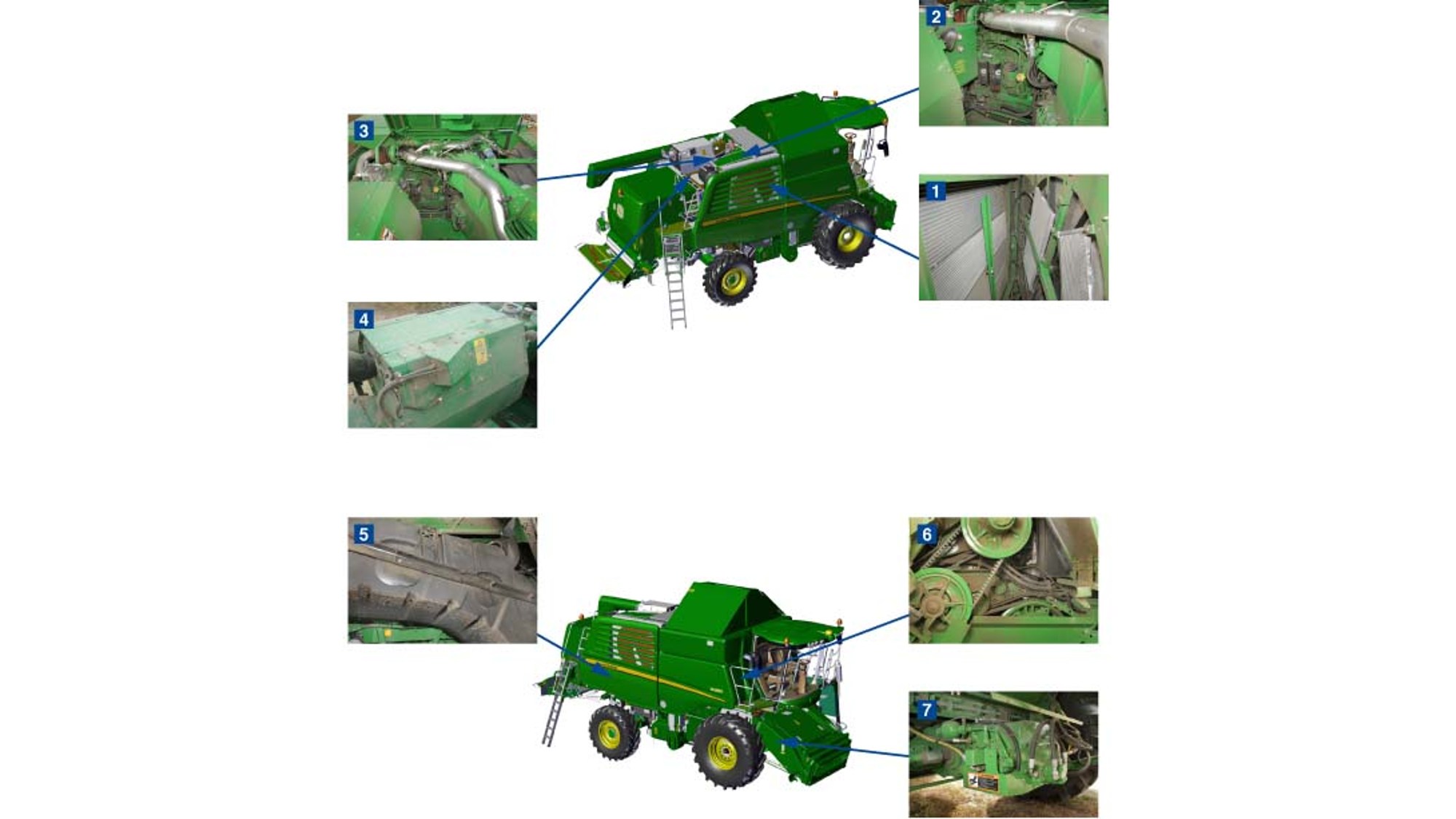 content can all impact where and how much crop material and debris can accumulate. Be aware of harvest conditions and adjust your cleaning schedule to ensure proper machine function and to reduce the risk of fire. These areas may require more frequent cleaning, even multiple times per day, depending on harvest conditions. Inspect and clean these areas as needed throughout the harvest day.