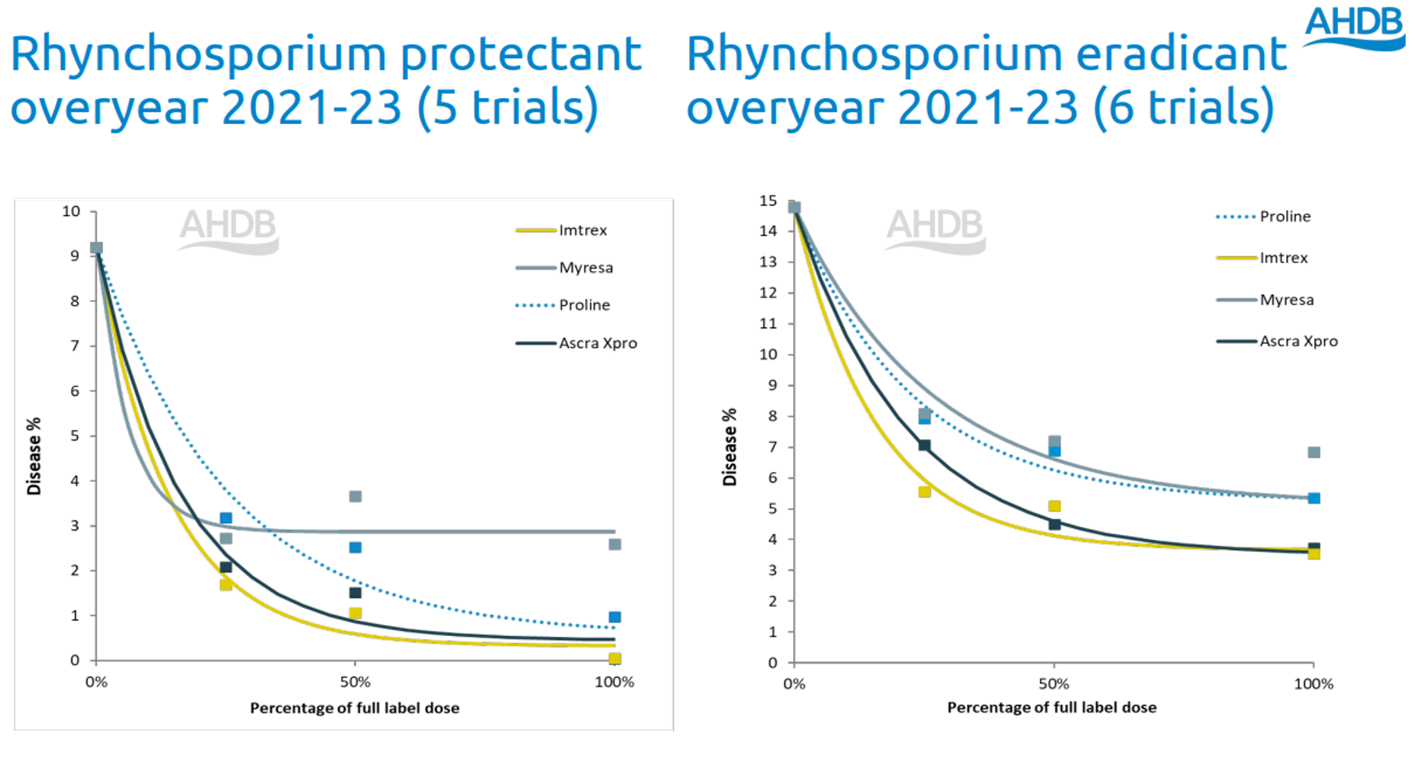 Both the ADHB curves and Teagasc trials illustrate that Xemium® is the strongest active available on Rhynchosporium. The addition F500 enhances the Rhynchosporium control, with F500 exhibiting good efficacy