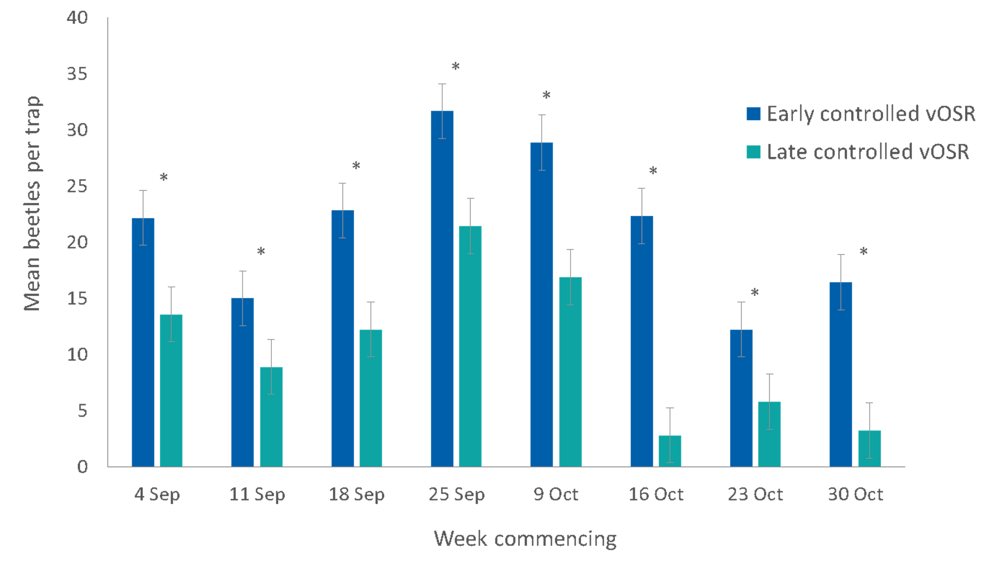 Migrating CSFB are attracted to plant volatiles given off by OSR. Leaving volunteer OSR until late September produces a trap crop that can divert migrating CSFB from drilled OSR. Trial work done in the CSFB IPM project found that delaying control of volunteers in this way significantly reduced adult numbers (Fig. 2) and damage, and significantly increased plant populations in nearby drilled OSR.