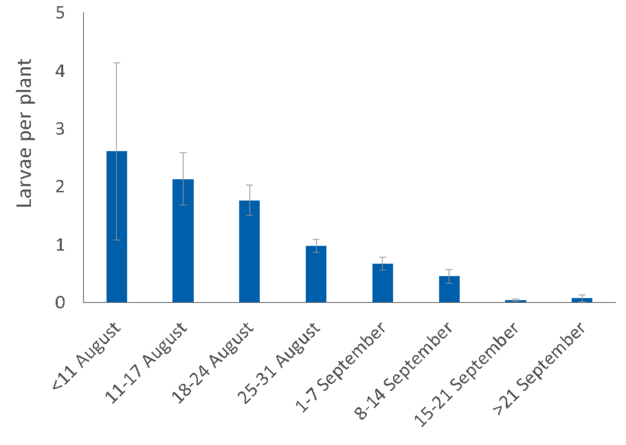 Conversely, crops drilled in September tend to have lower larval populations in the autumn and spring than those drilled in August (Fig. 1). This may be due to these crops emerging after peak CSFB migration has passed and because eggs laid in these crops will develop in cooler temperatures than those laid earlier in earlier drilled crops, slowing their development. While there are increased risks to late drilling, trial work suggests that the drilling window for OSR is larger than perceived. These risks will also be reduced by choosing varieties suited to late drilling.