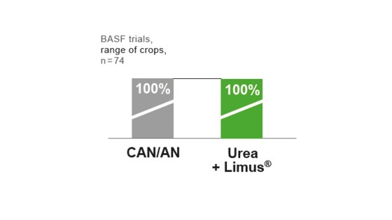 Across 74 BASF trials, Limus® raised the performance of granular urea up to the level of calcium ammonium nitrate and ammonium nitrate. In the six trials with ADAS, at a rate of 260kg/ha N, Limus® protected granular urea outperformed AN by an average of 1.5%.