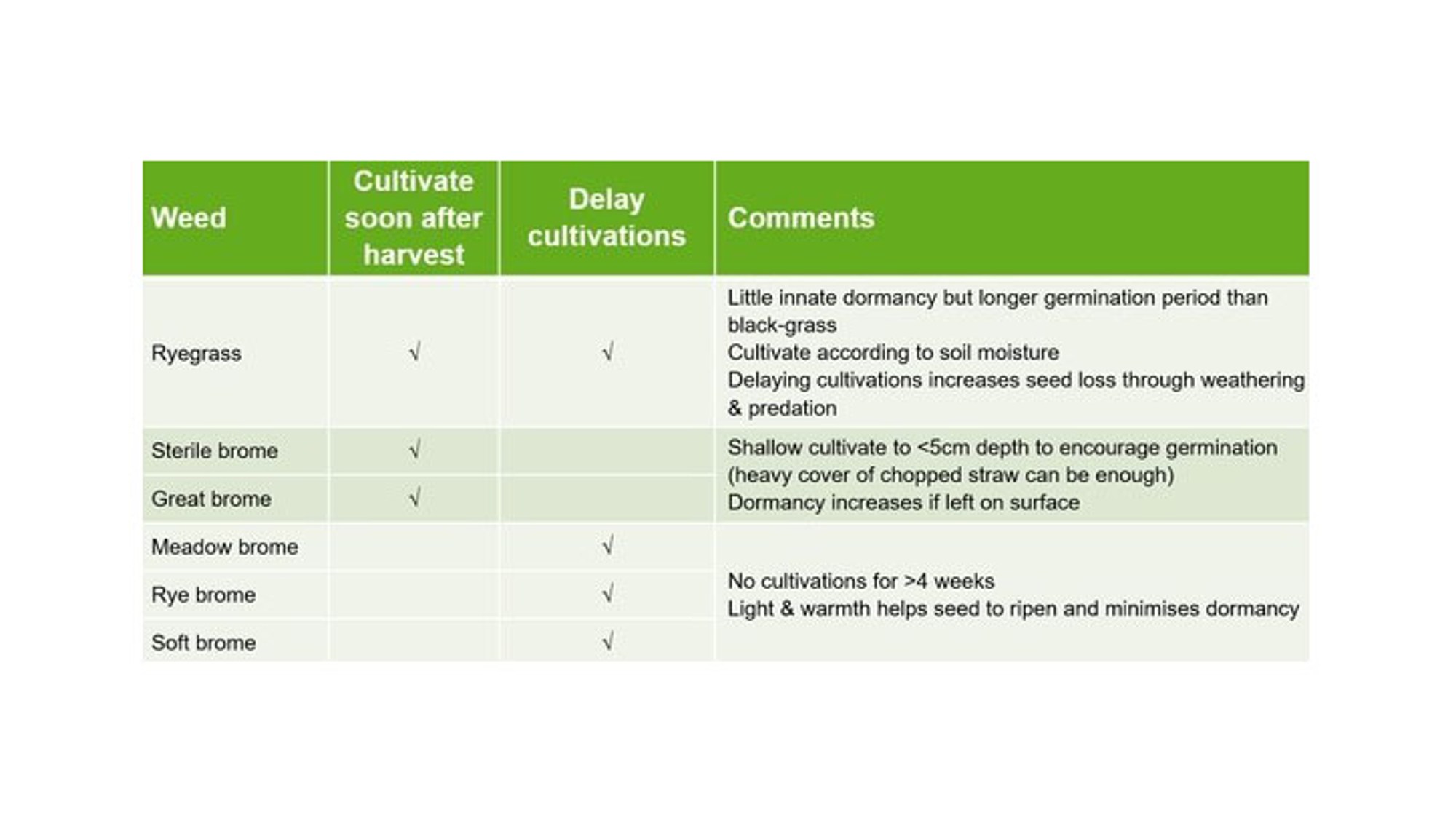 However, it is important to know which brome species are present so that the timing of cultivations to prepare a stale seedbed can be adapted accordingly, as shown in the table below.
