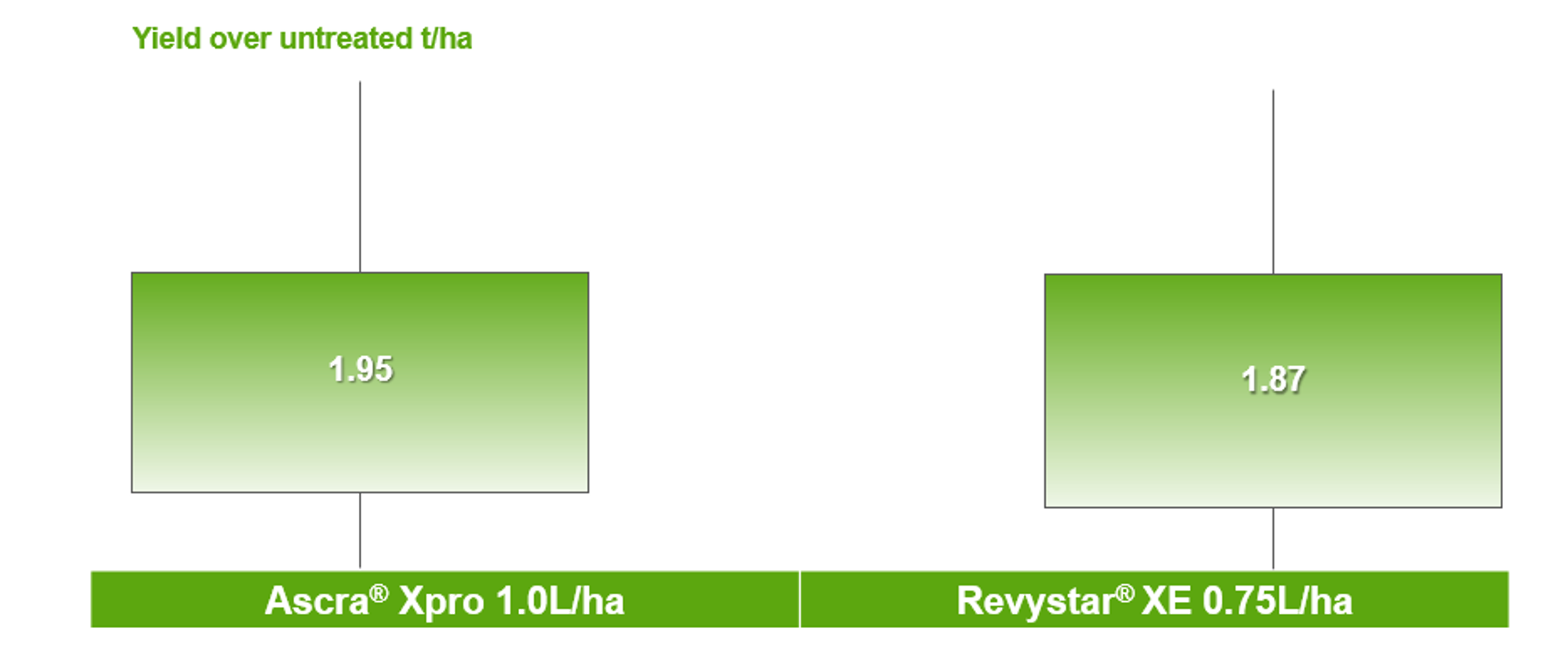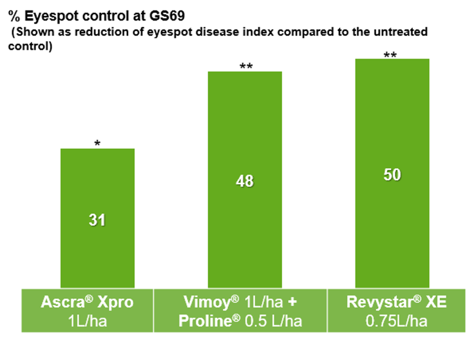 ** Significant difference at 5% confidence level, based on eyespot disease index relative to Ascra® Xpro