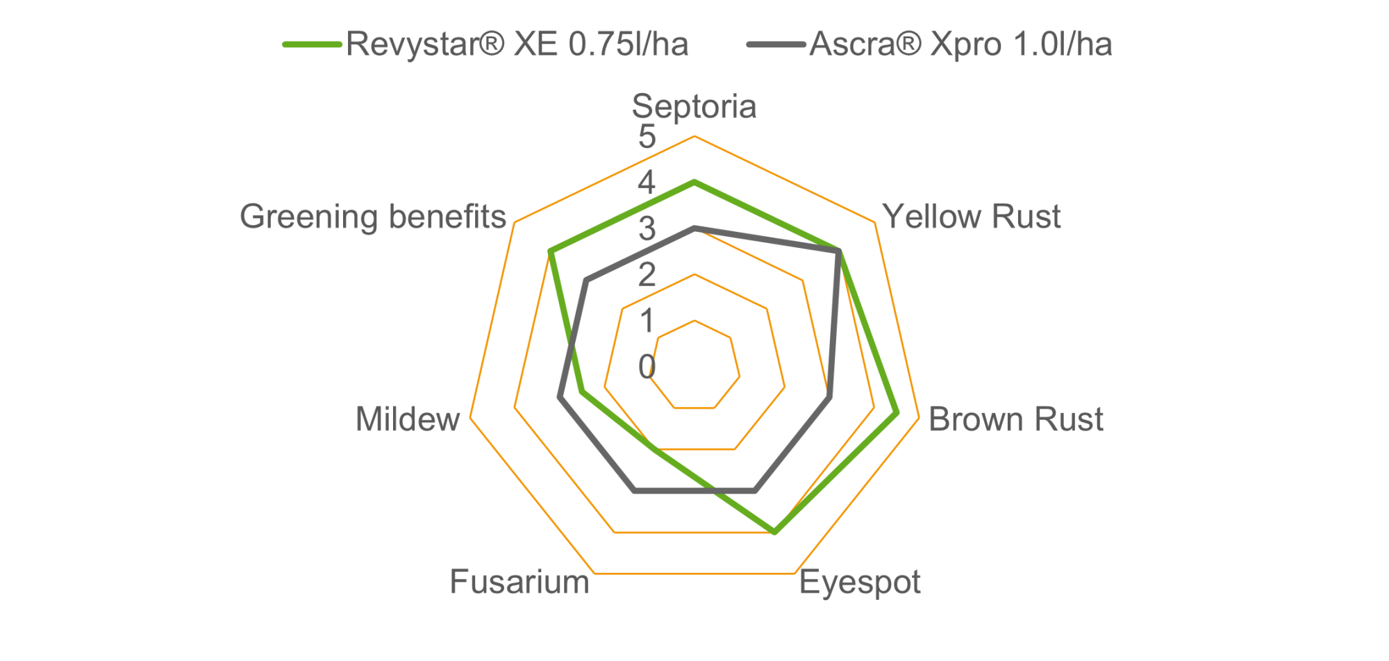 | Disease activity | Broad spectrum including Septoria tritici, yellow rust, brown rust, powdery mildew, net blotch, Rhynchosporium, Ramularia and crown rust |