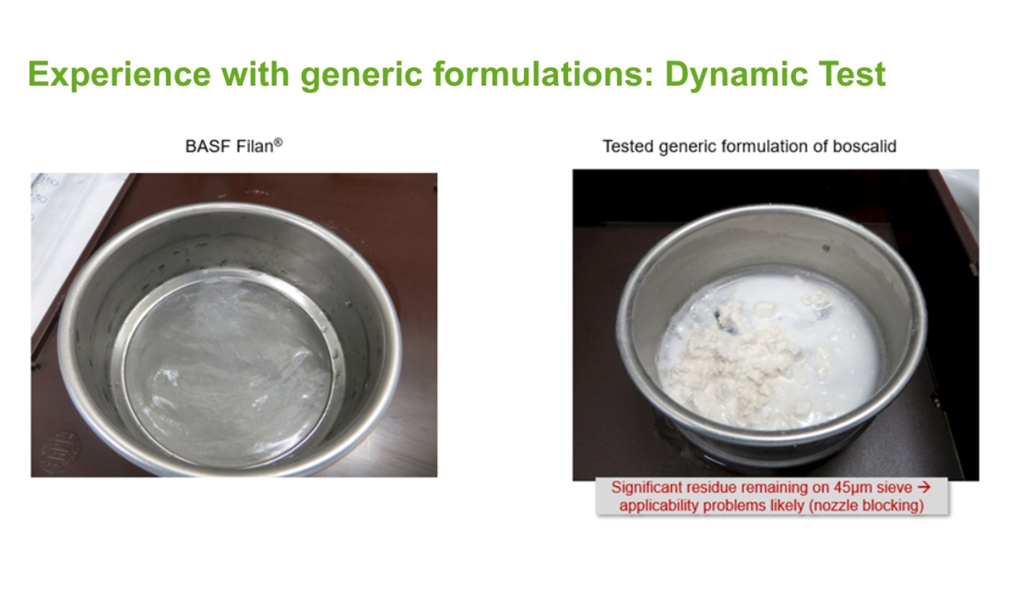 Our scientists are uncovering a growing problem, post‑patent copies of BASF products simply aren’t performing as they should. While some generic manufacturers deliver valuable new options, others put poorly formulated products on the market leading to real‑world consequences such as reduced efficacy, inconsistent performance, and practical headaches like blocked filters and nozzles.