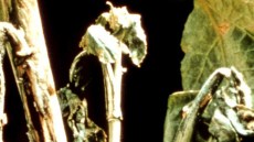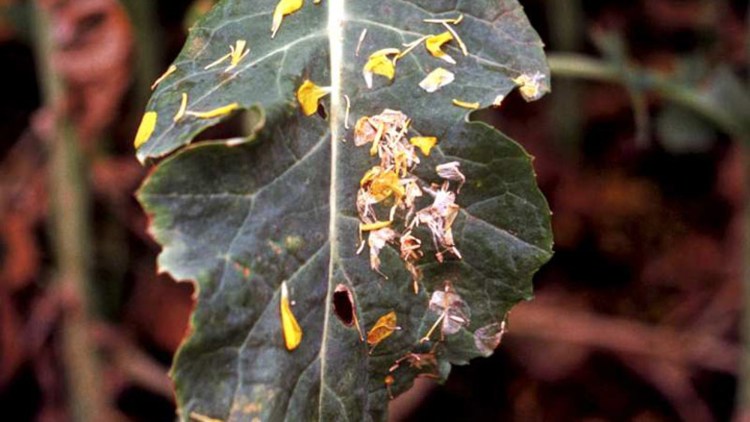 Brown soft rots or leaf spots with tufts of grey sporulating fungal growth are the most common symptoms. Scorch caused by frost, chemical or fertilisers are rapidly colonised by grey mould and a progressive rot develops unless conditions are sufficiently dry for the infected tissues to dry out. Stem rots during stem extension and flowering are often associated with nitrogen fertiliser scorch. Stem lesions are white to greyish brown and can be difficult to distinguish from sclerotinia stem rot unless grey mould is sporulating on the lesion. Grey leaf spots and more extensive leaf rots occur where petals adhering to the foliage enable grey mould to become established. The leaf lesions may show concentric zones and be difficult to distinguish from target spots caused by Alternaria spp. Individual pods may be completely covered in sporulating grey mould. This is usually associated with damage from pests such as bladder pod midge.