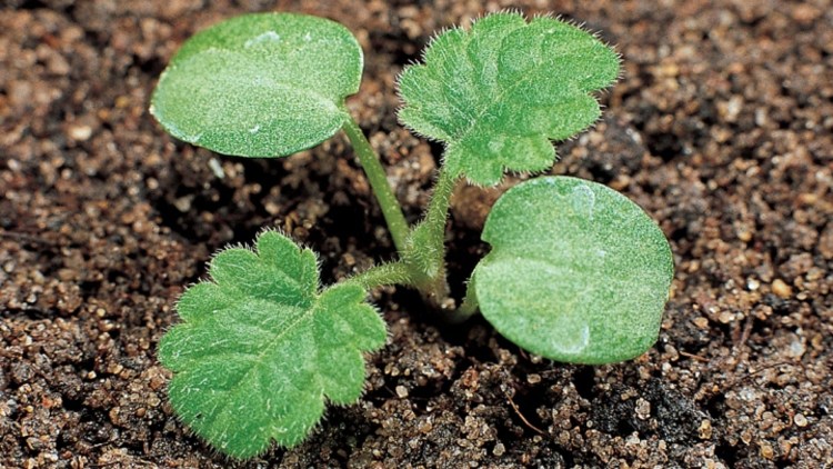 Young plant: The first true leaves are more triangular than those of henbit dead-nettle.
